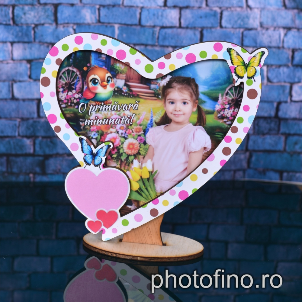 Această ramă foto personalizată, cu un design deosebit în formă de inimă, este cadoul ideal pentru a-i face o bucurie unei persoane dragi cu ocazia primăverii. Realizată din materiale durabile, cu o finisare impecabilă, această ramă va aduce o notă de căldură și veselie în orice încăpere. Poate fi personalizată cu o fotografie dragă și cu un text la alegere, devenind un suvenir unic și prețios.