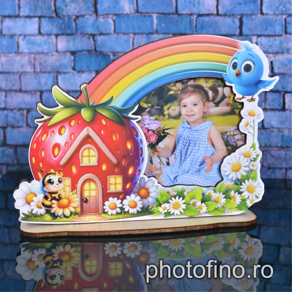 Această ramă foto personalizată, cu un design de poveste, este cadoul perfect pentru orice ocazie specială. Cu o grafică vibrantă care înfățișează un curcubeu colorat, o căpșună magică, această ramă va aduce o notă de bucurie și veselie în camera oricărui copil. Realizată din materiale durabile și cu o finisare impecabilă, această ramă foto este o modalitate minunată de a păstra vie amintirea unui moment prețios. Poate fi așezată pe orice suprafață plană, fiind ideală pentru birou sau noptieră.