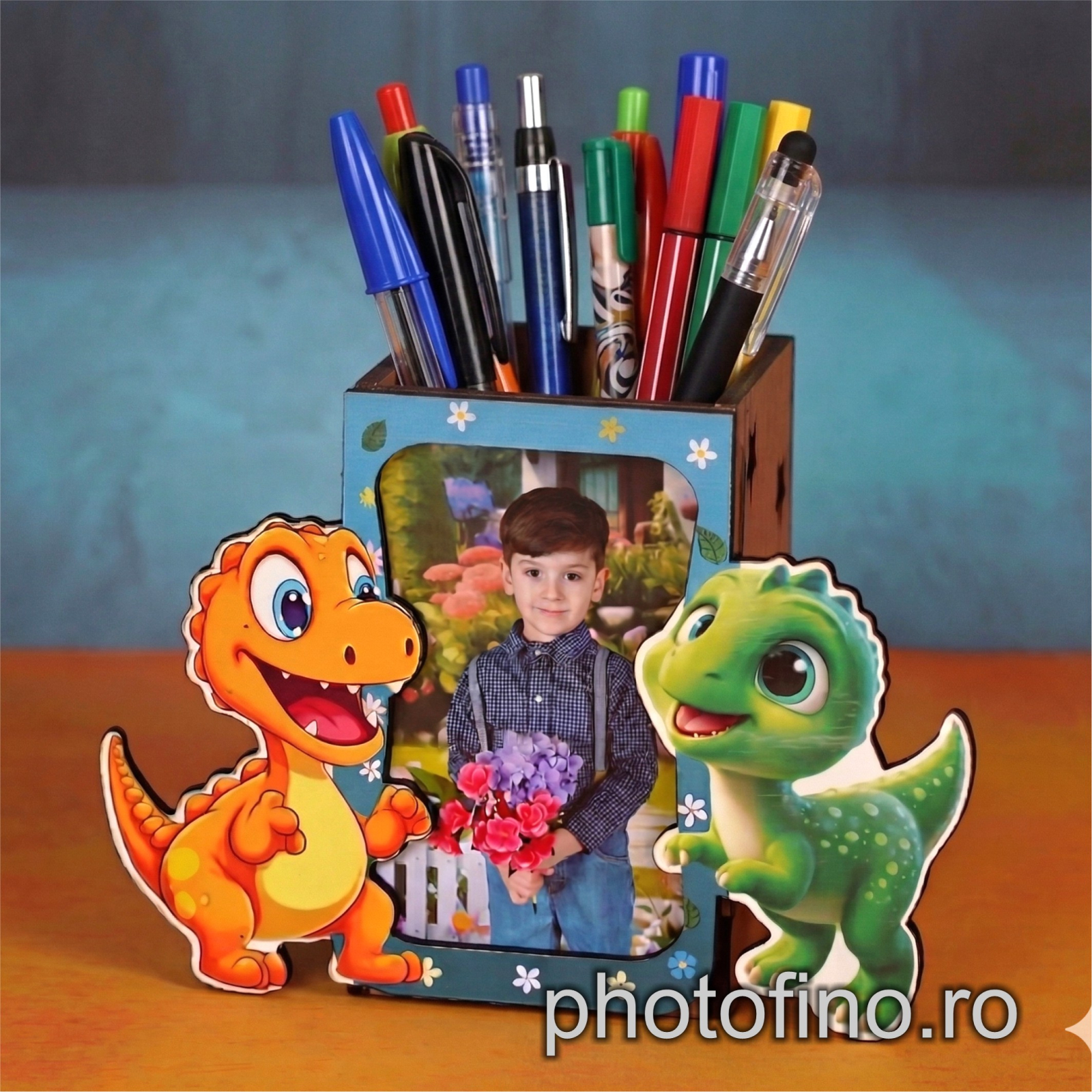Acest suport pentru pixuri cu tematică dinozauri este o alegere excelentă pentru a-l face pe micuțul tău să fie entuziasmat de teme! Cu un design colorat și distractiv, acest suport va aduce un plus de veselie în camera oricărui copil. Poate fi personalizat cu o fotografie dragă, devenind un suvenir unic și prețios. Realizat din materiale durabile, acest suport va fi un prieten de nădejde pe biroul copilului tău. Este potrivit pentru a fi așezat pe orice suprafață plană.